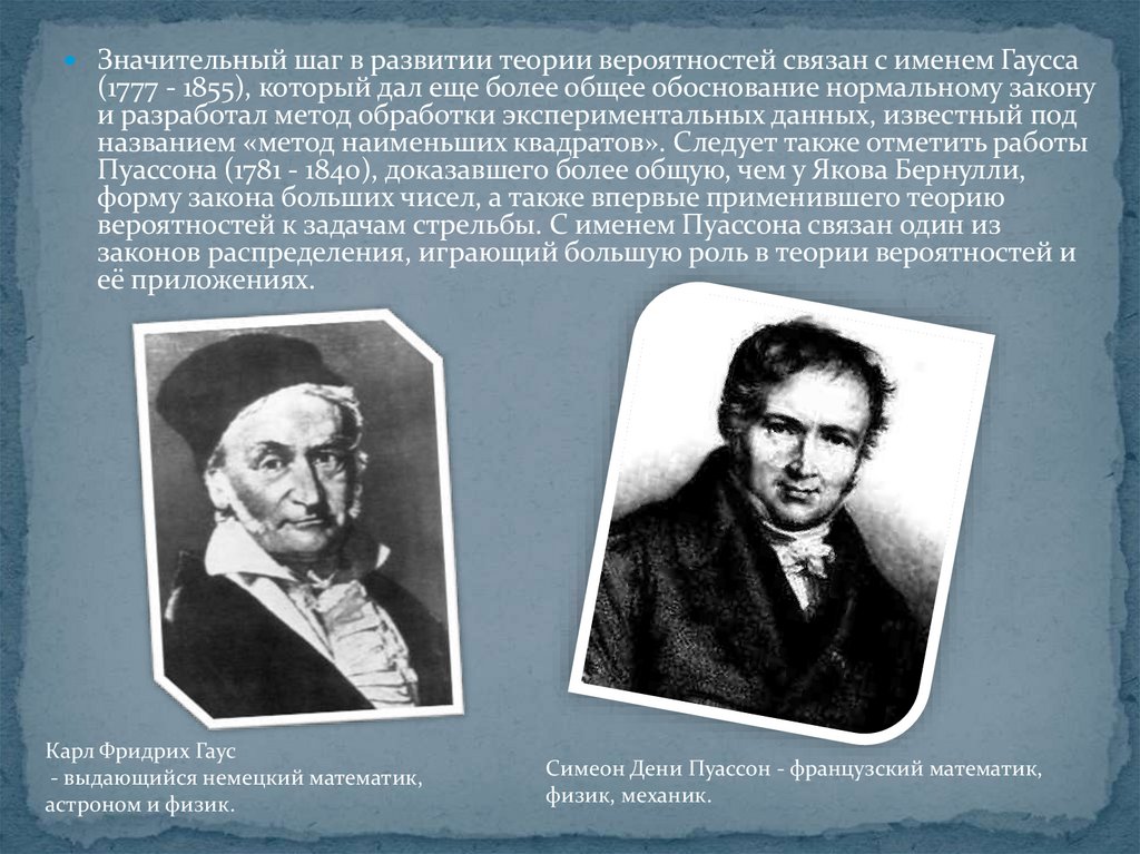Значительный шаг в развитии теории вероятностей связан с именем Гаусса(1777 - 1855), который дал еще более общее обоснование нормальному закону