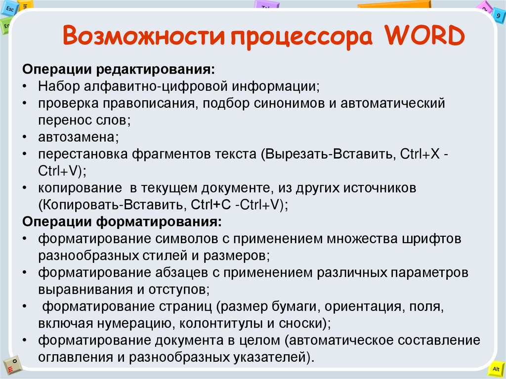 Возможности процессора WORDОперации редактирования: