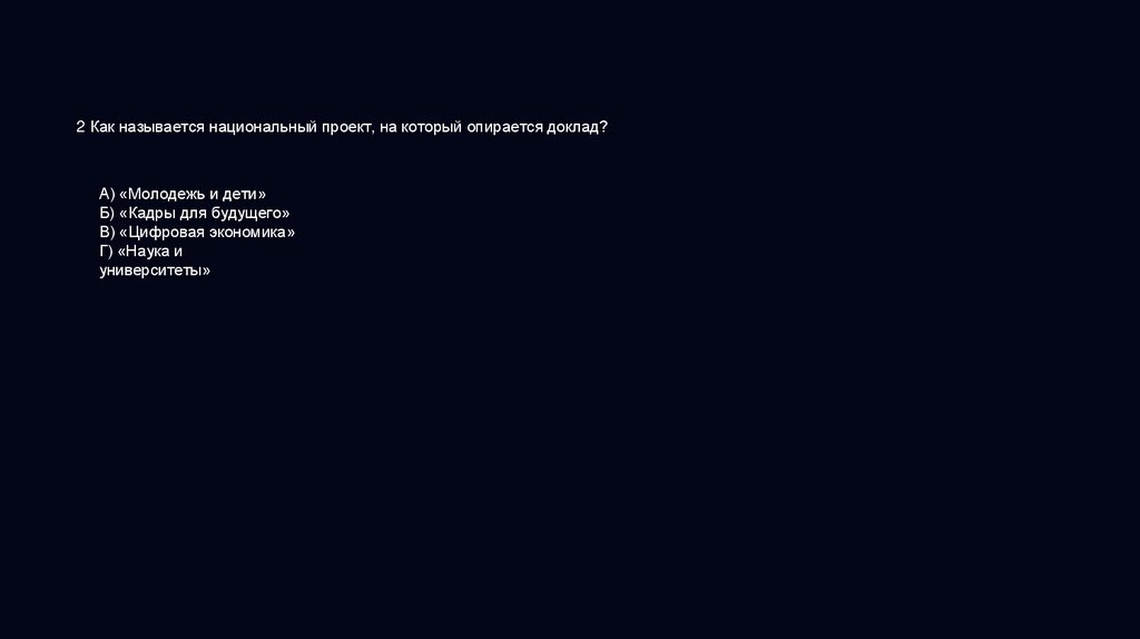 2 Как называется национальный проект, на который опирается доклад?А) «Молодежь и дети»