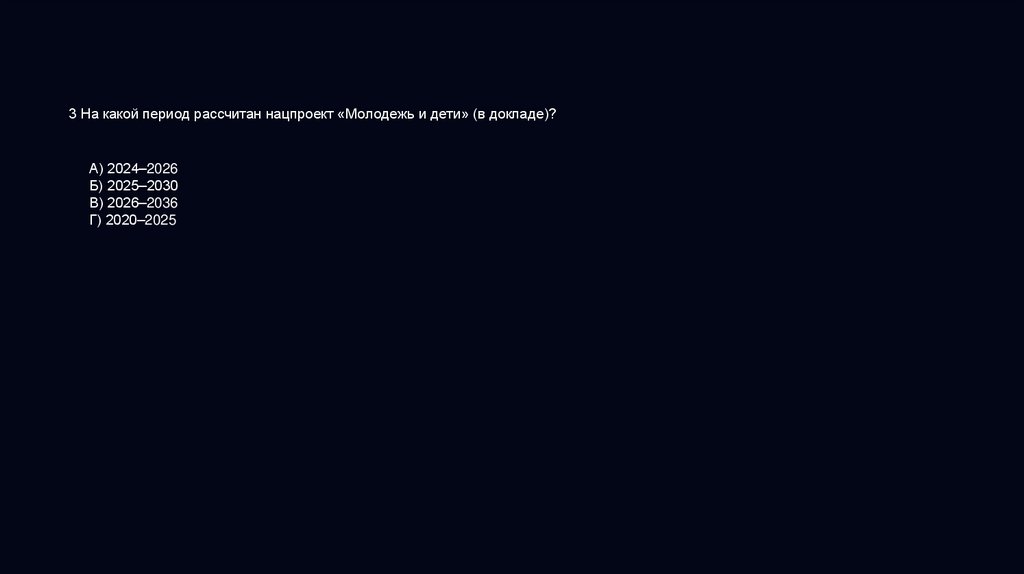 3 На какой период рассчитан нацпроект «Молодежь и дети» (в докладе)?А) 2024–2026