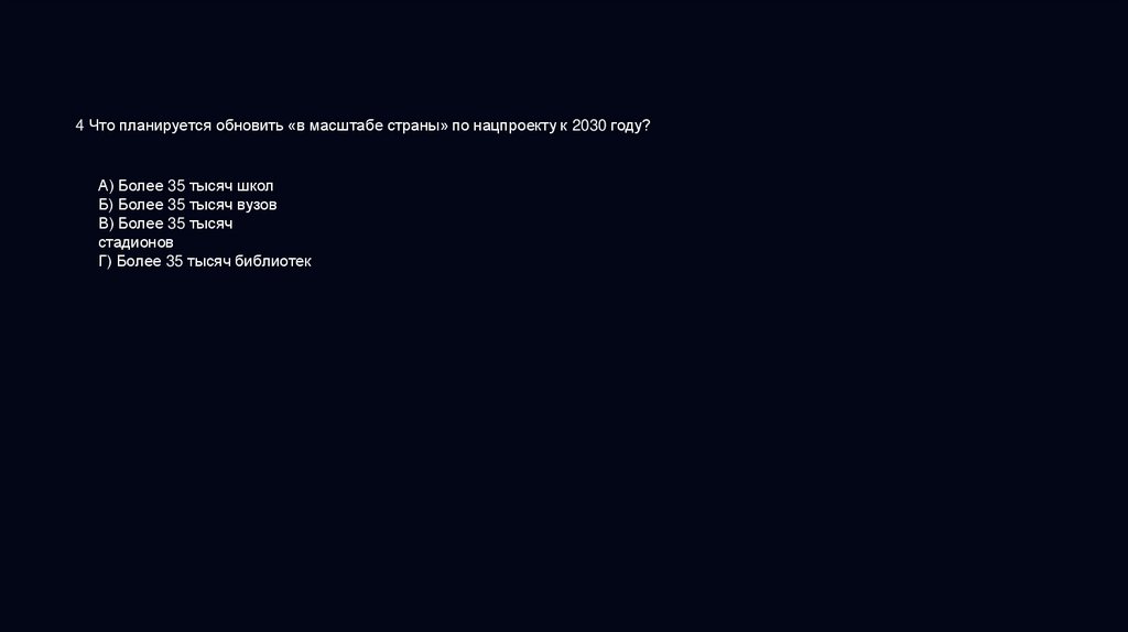 4 Что планируется обновить «в масштабе страны» по нацпроекту к 2030 году?А) Более 35 тысяч школ