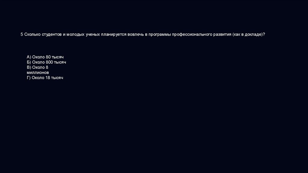 5 Сколько студентов и молодых ученых планируется вовлечь в программы профессионального развития (как в докладе)?А) Около 80 тысяч