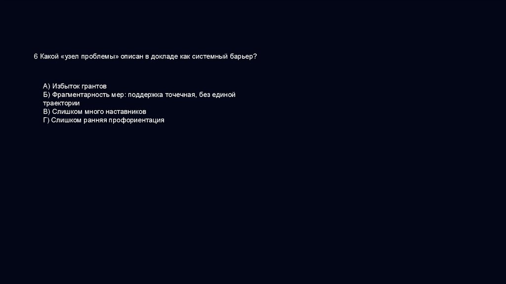 6 Какой «узел проблемы» описан в докладе как системный барьер?А) Избыток грантов