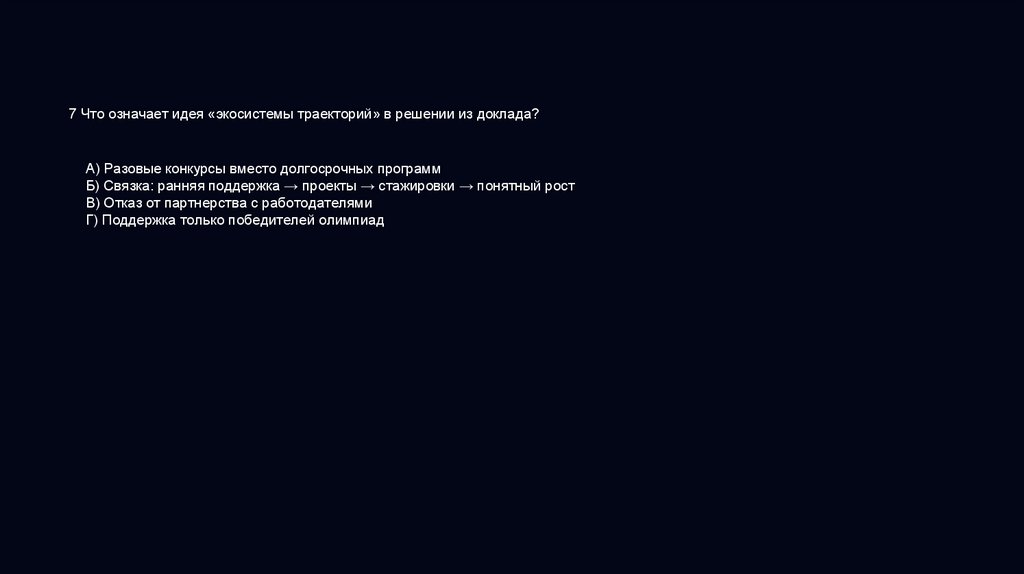 7 Что означает идея «экосистемы траекторий» в решении из доклада?А) Разовые конкурсы вместо долгосрочных программ