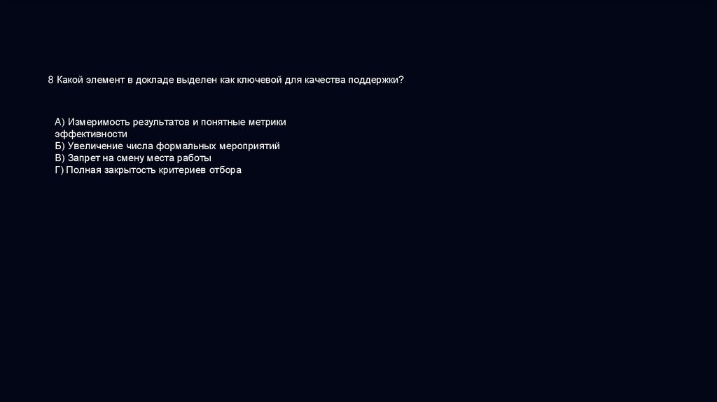 8 Какой элемент в докладе выделен как ключевой для качества поддержки?А) Измеримость результатов и понятные метрики