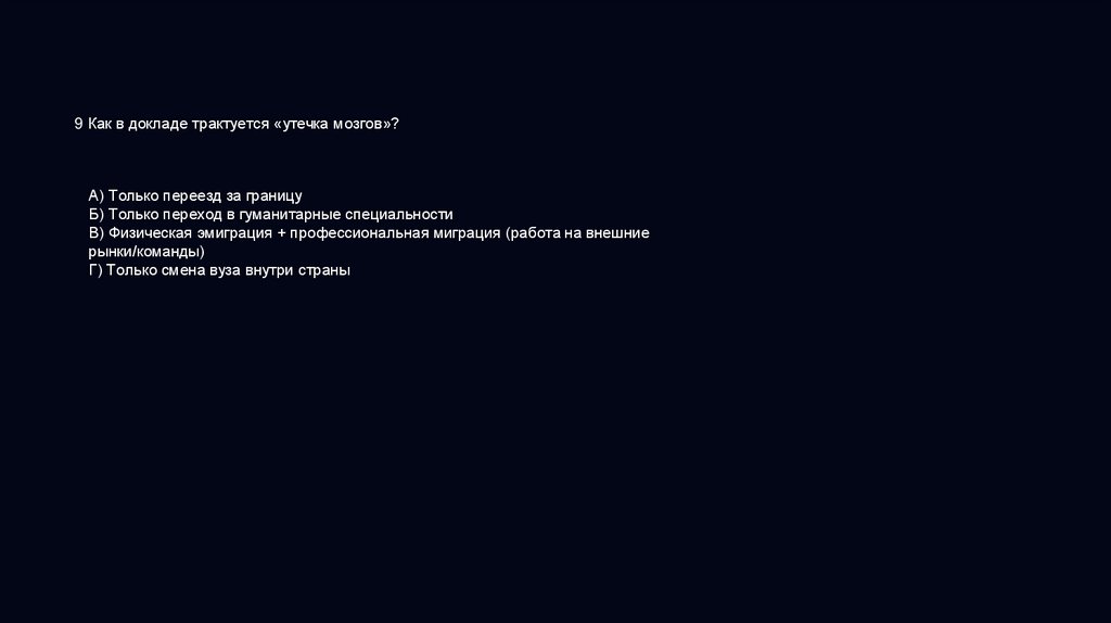 9 Как в докладе трактуется «утечка мозгов»?А) Только переезд за границу