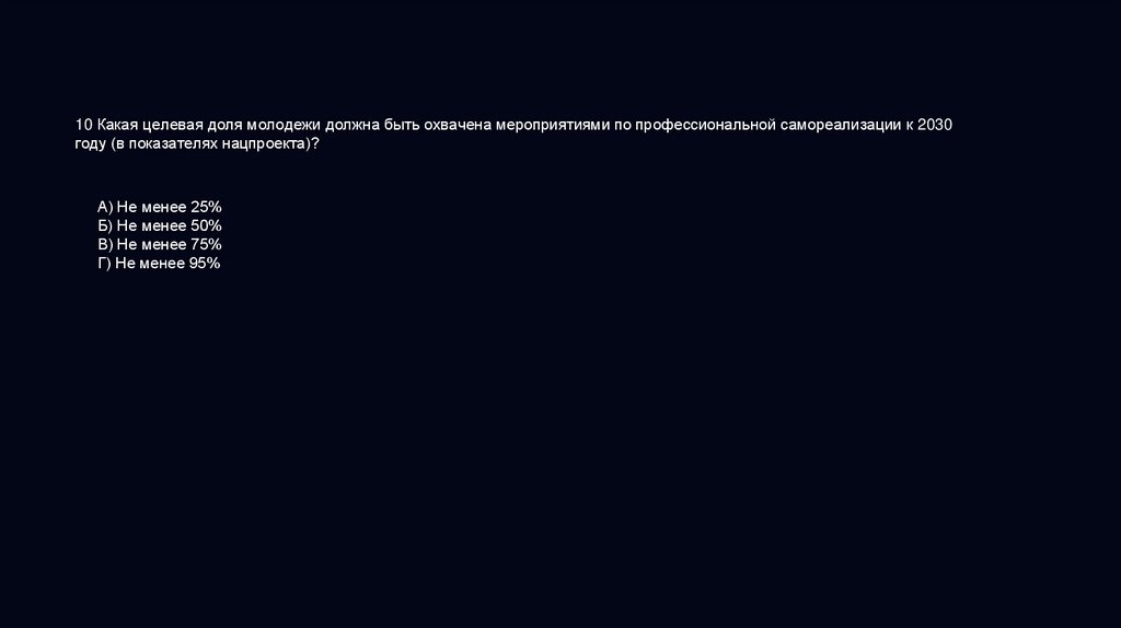 10 Какая целевая доля молодежи должна быть охвачена мероприятиями по профессиональной самореализации к 2030году (в показателях нацпроекта)?