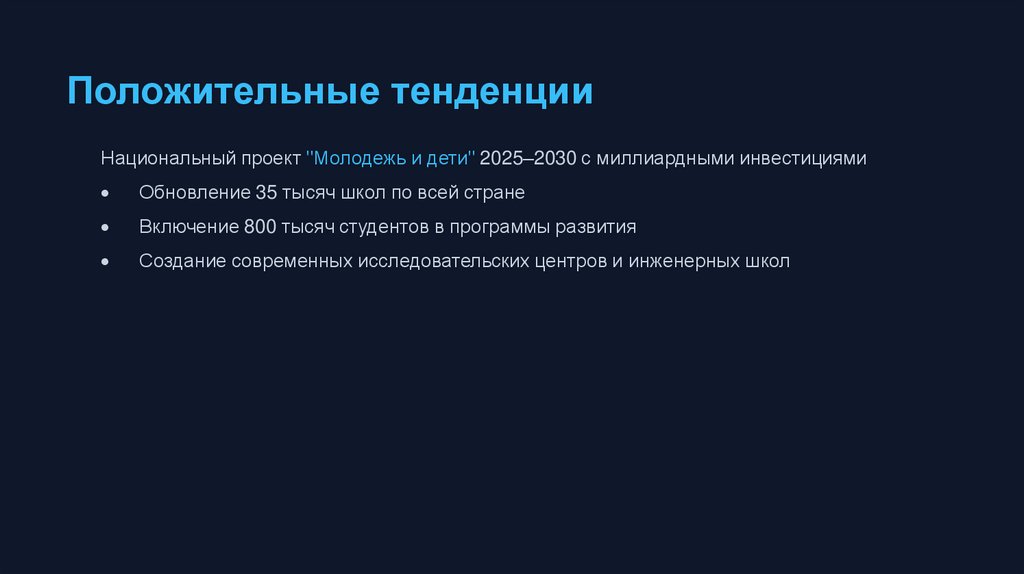 Положительные тенденцииНациональный проект "Молодежь и дети" 2025–2030 с миллиардными инвестициями