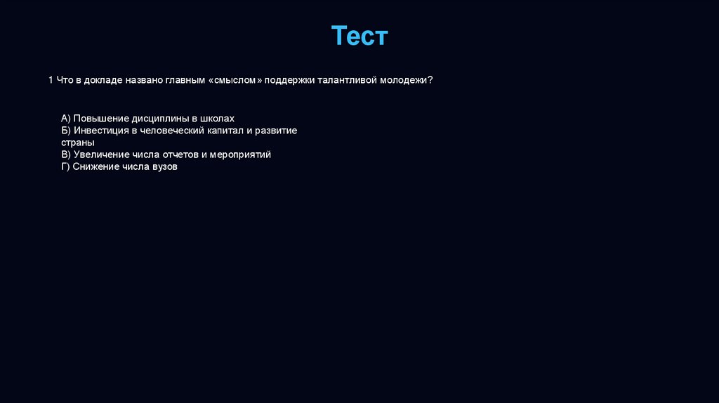 Тест1 Что в докладе названо главным «смыслом» поддержки талантливой молодежи?