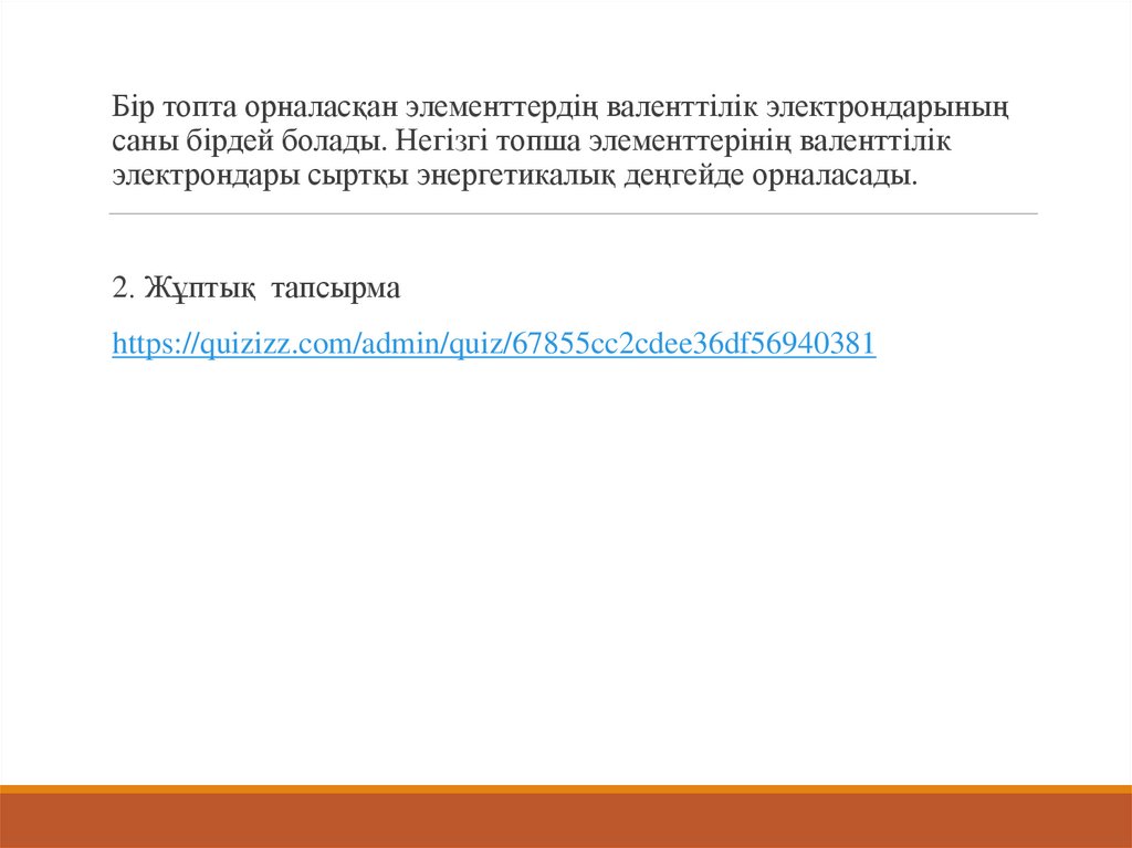 8.2.1.2 -бір топтағы элементтердің сыртқы электрондық деңгейіндеэлектрондар санының бірдей болатындығын түсіну
