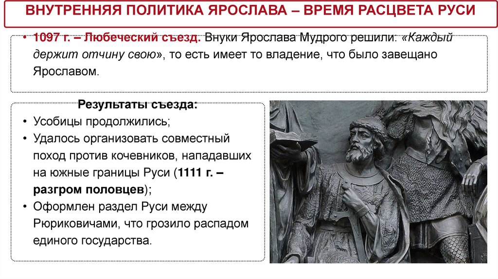 ВНУТРЕННЯЯ ПОЛИТИКА ЯРОСЛАВА – ВРЕМЯ РАСЦВЕТА РУСИ• 1097 г. – Любеческий съезд. Внуки Ярослава Мудрого решили: «Каждый