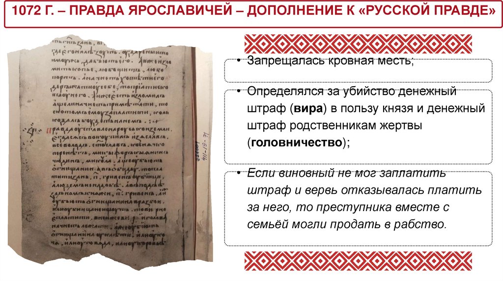 1072 Г. – ПРАВДА ЯРОСЛАВИЧЕЙ – ДОПОЛНЕНИЕ К «РУССКОЙ ПРАВДЕ»• Запрещалась кровная месть;