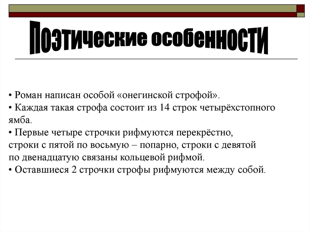 • Роман написан особой «онегинской строфой».• Каждая такая строфа состоит из 14 строк четырёхстопного