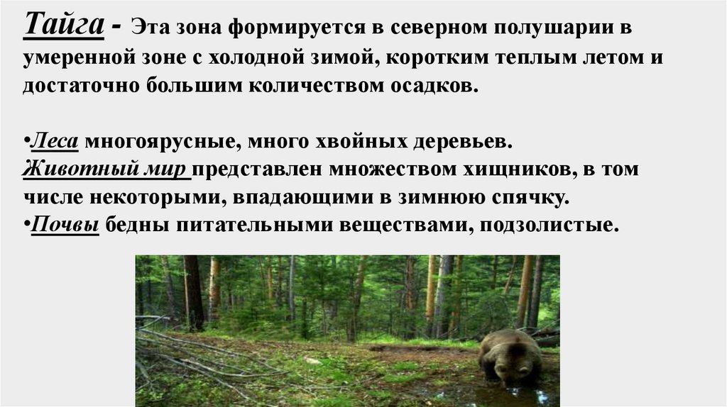 Тайга - Эта зона формируется в северном полушарии вумеренной зоне с холодной зимой, коротким теплым летом и