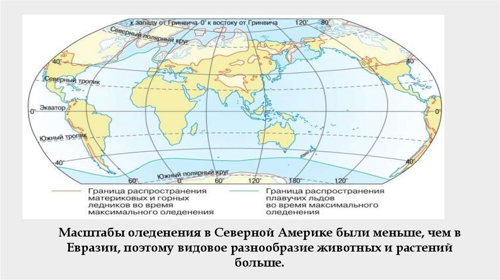 Масштабы оледенения в Северной Америке были меньше, чем вЕвразии, поэтому видовое разнообразие животных и растений