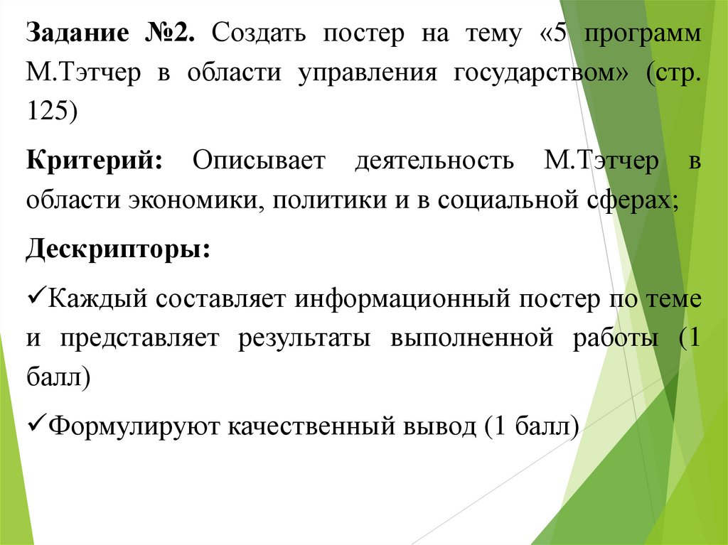 Задание №2. Создать постер на тему «5 программМ.Тэтчер в области управления государством» (стр.
