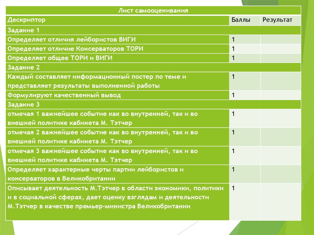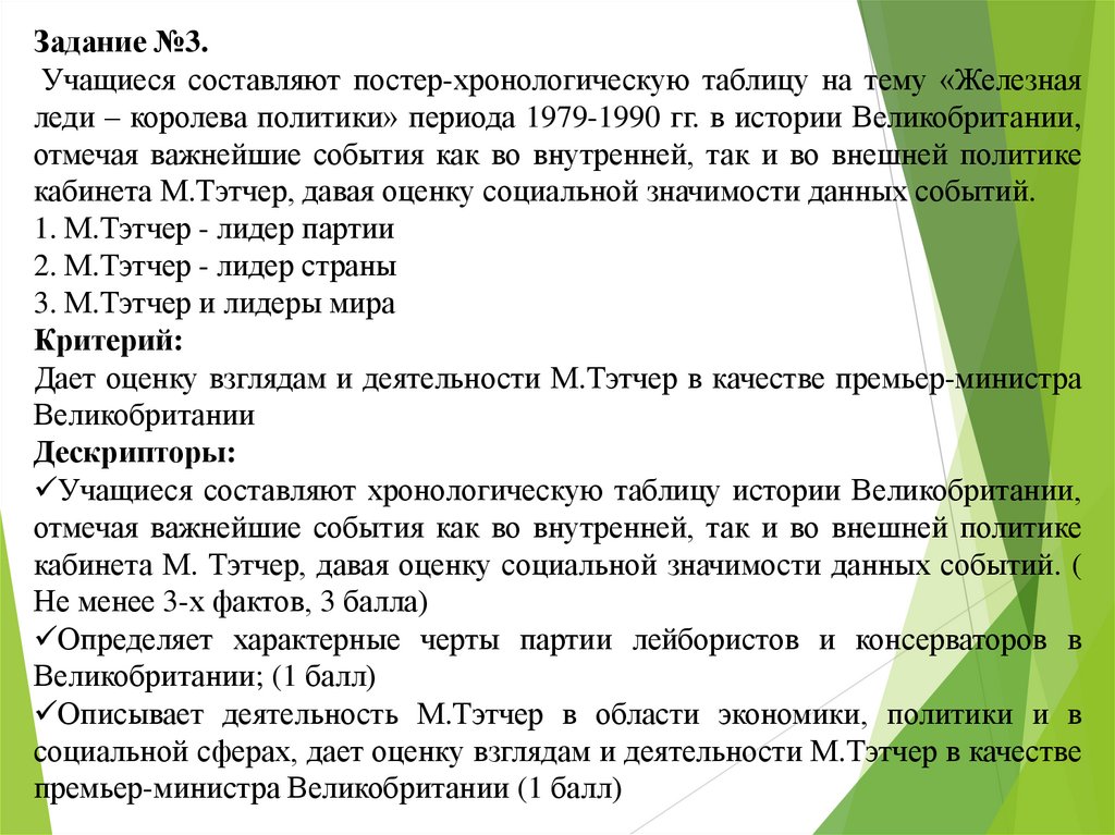 Критерий: Описывает деятельность М.Тэтчер в