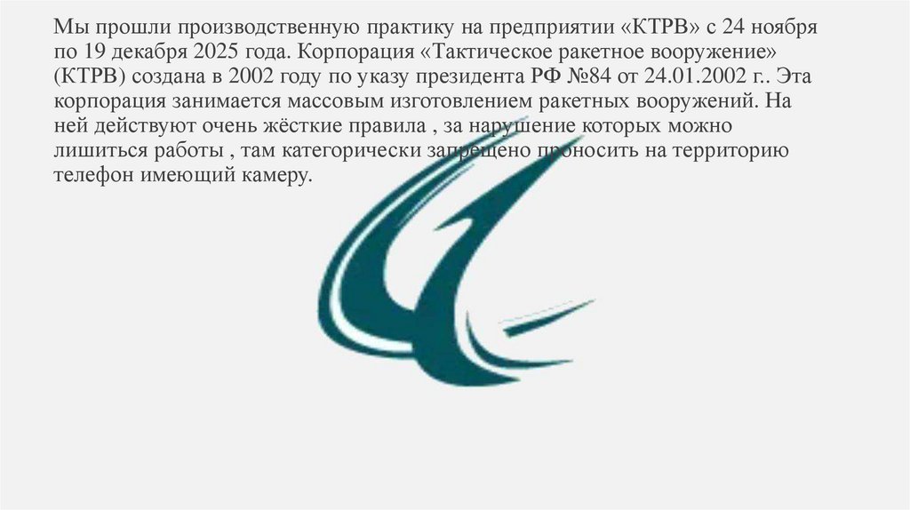 Мы прошли производственную практику на предприятии «КТРВ» с 24 ноябряпо 19 декабря 2025 года. Корпорация «Тактическое ракетное вооружение»
