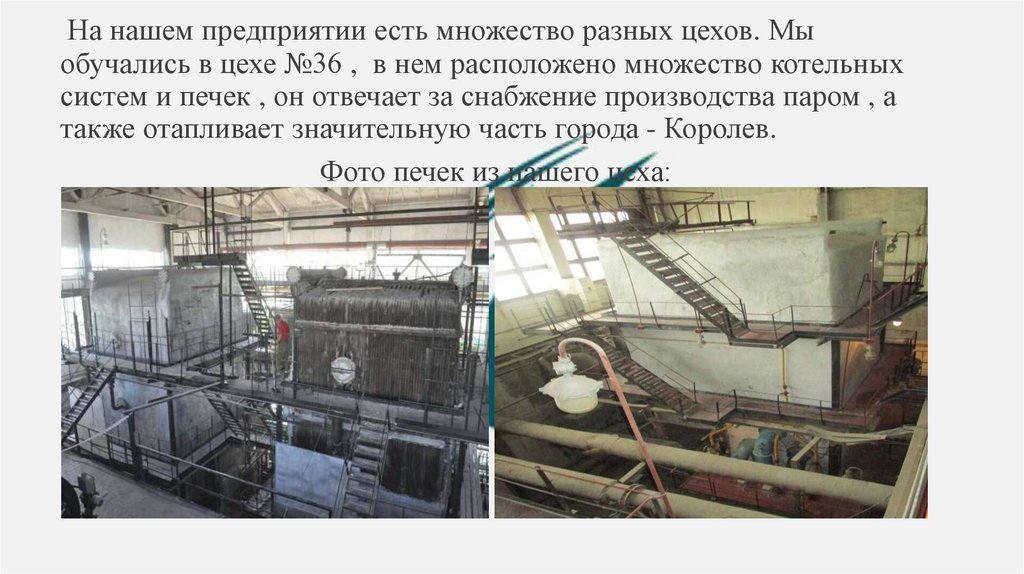 На нашем предприятии есть множество разных цехов. Мыобучались в цехе №36 , в нем расположено множество котельных