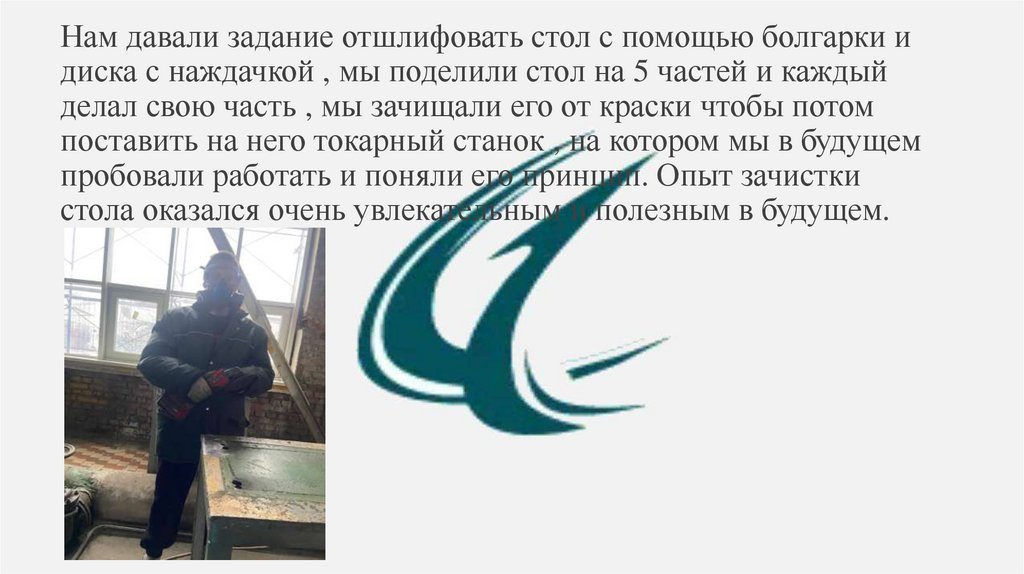 Нам давали задание отшлифовать стол с помощью болгарки идиска с наждачкой , мы поделили стол на 5 частей и каждый
