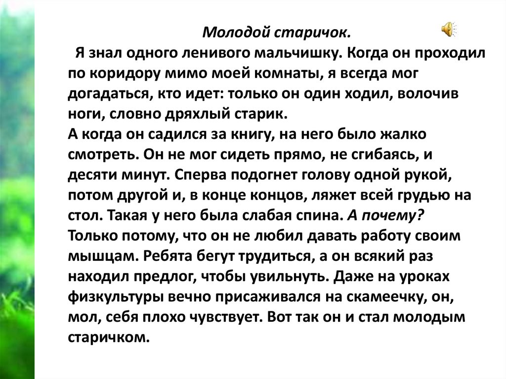 Молодой старичок.Я знал одного ленивого мальчишку. Когда он проходил