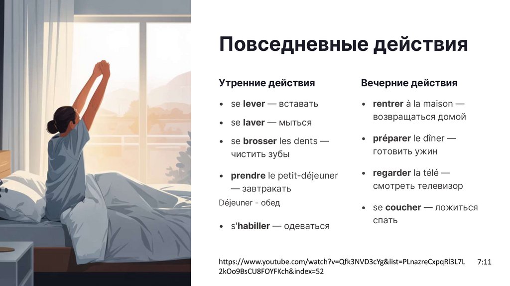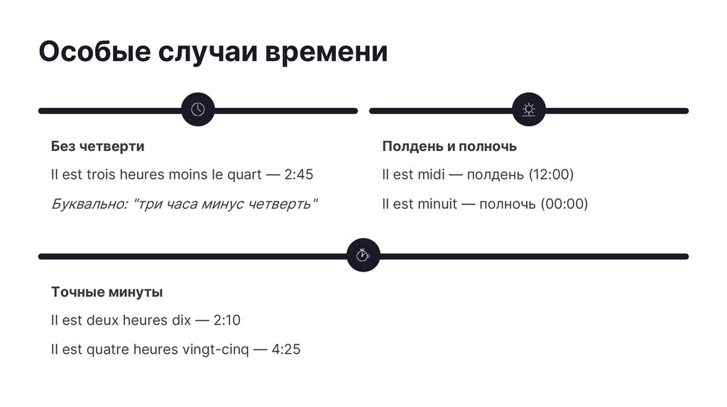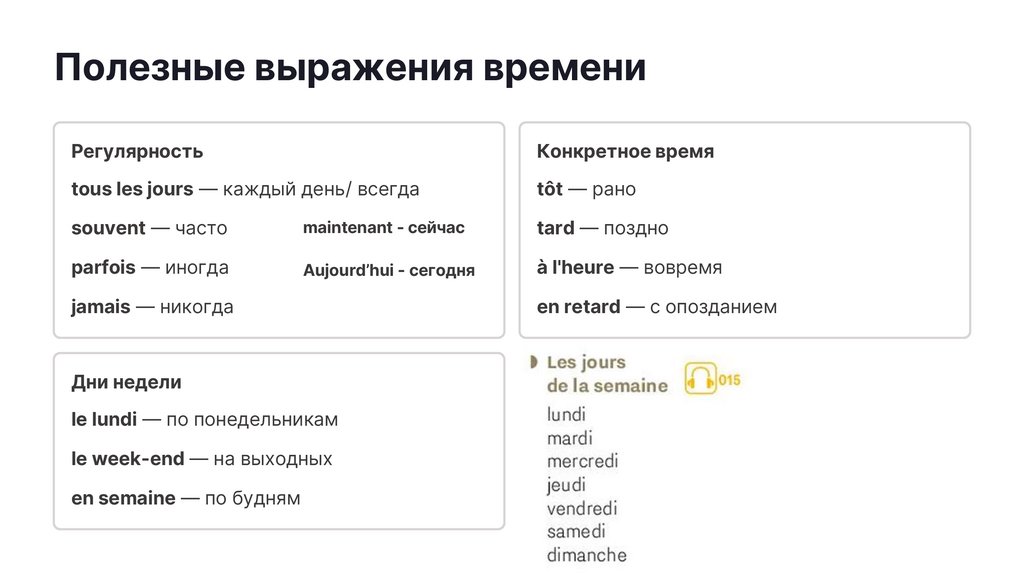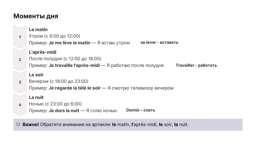 Важно! Обратите внимание на артикли: le matin, l'après-midi, le soir, la nuit.