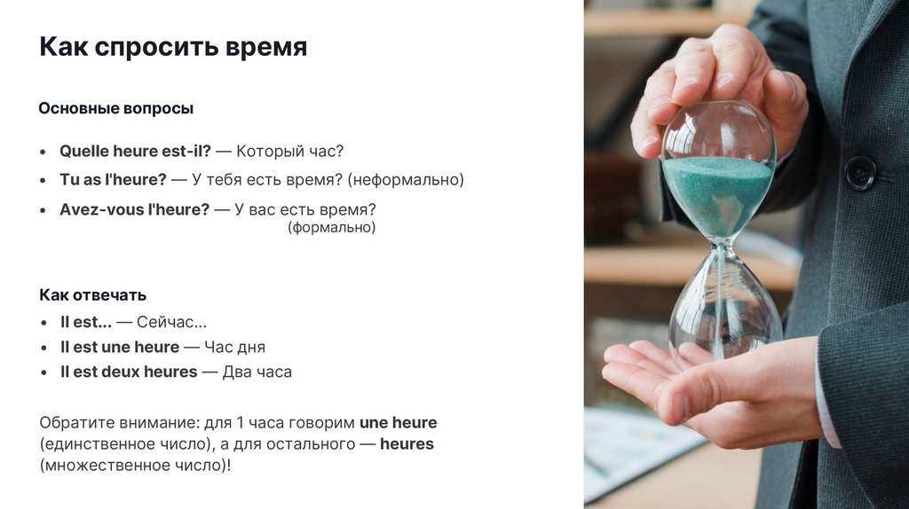 • Tu as l'heure? — У тебя есть время? (неформально)