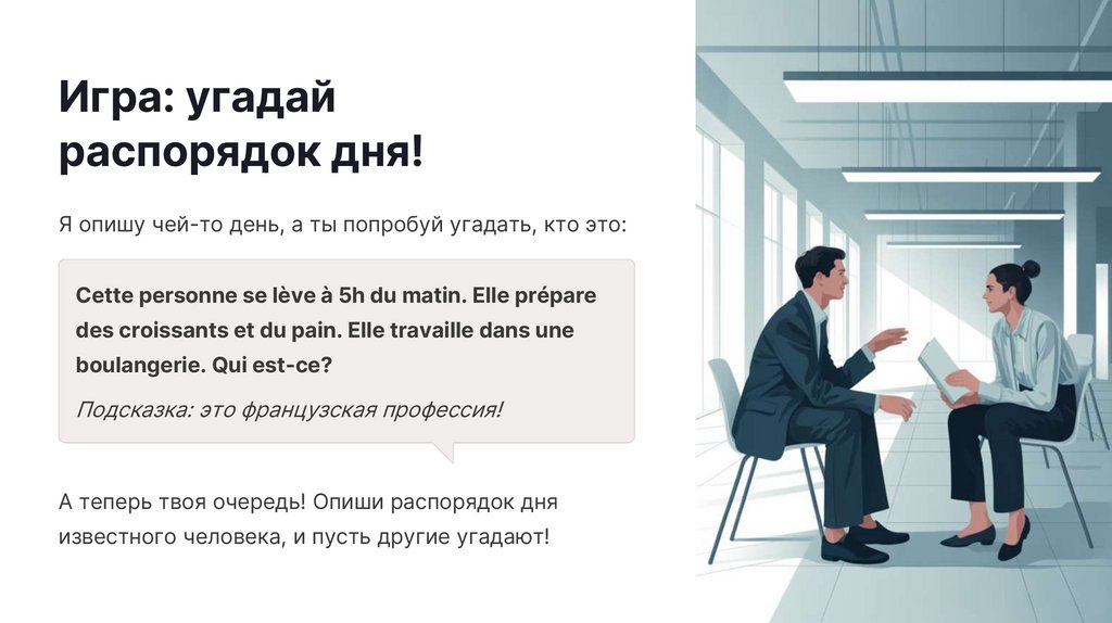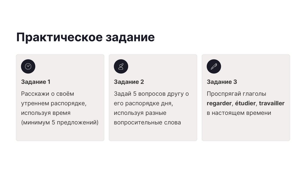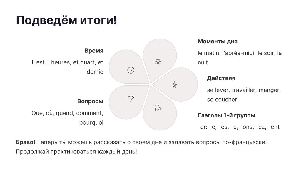 Браво! Теперь ты можешь рассказать о своём дне и задавать вопросы по-французски.