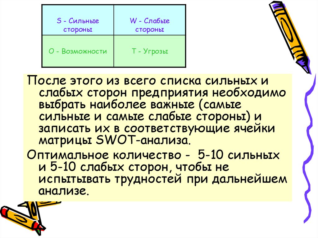 S - Сильные стороны W - Слабые стороныO - Возможности