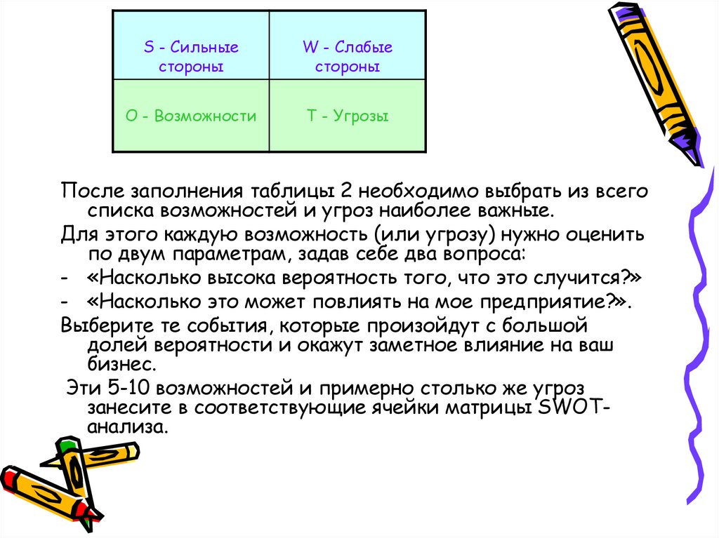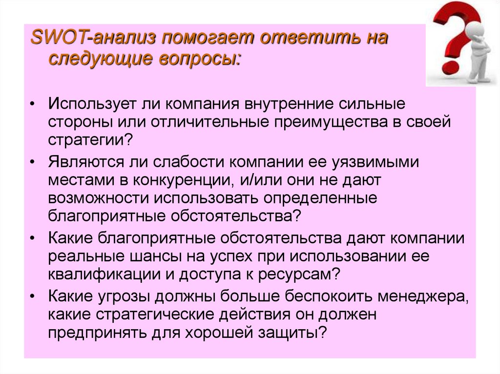 SWOT-анализ помогает ответить наследующие вопросы: