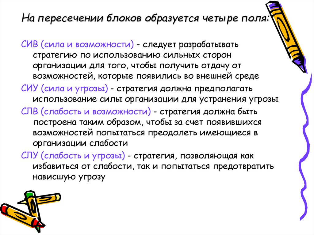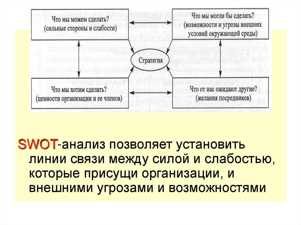 SWOT-анализ позволяет установитьлинии связи между силой и слабостью,