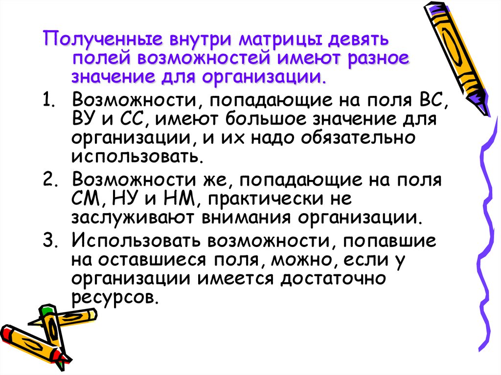 Полученные внутри матрицы девятьполей возможностей имеют разное