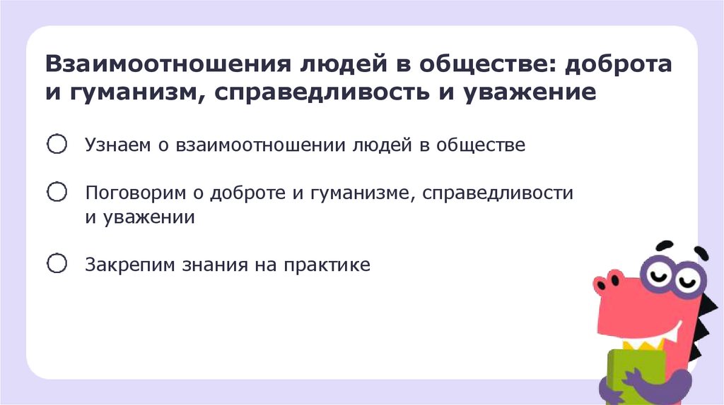 Взаимоотношения людей в обществе: добротаи гуманизм, справедливость и уважение