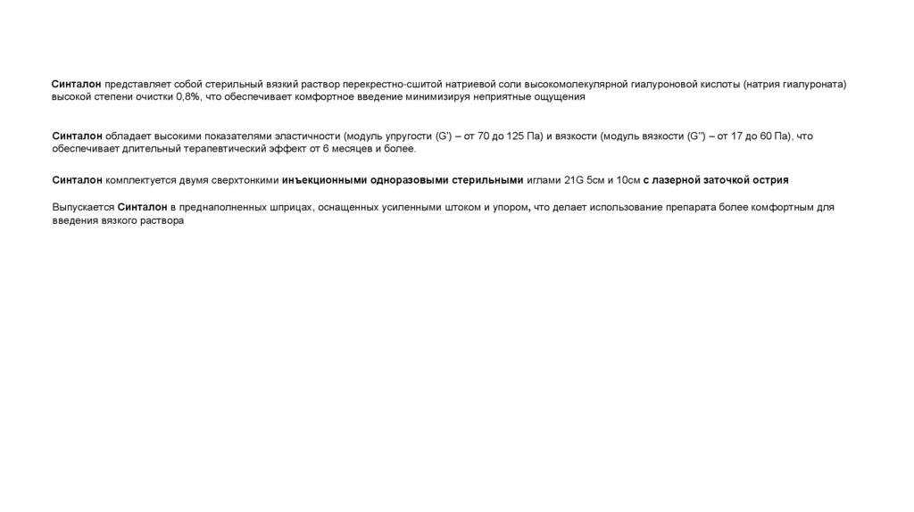 Синталон представляет собой стерильный вязкий раствор перекрестно-сшитой натриевой соли высокомолекулярной гиалуроновой кислоты (натрия гиалуроната)высокой степени очистки 0,8%, что обеспечивает комфортное введение минимизируя неприятные ощущения