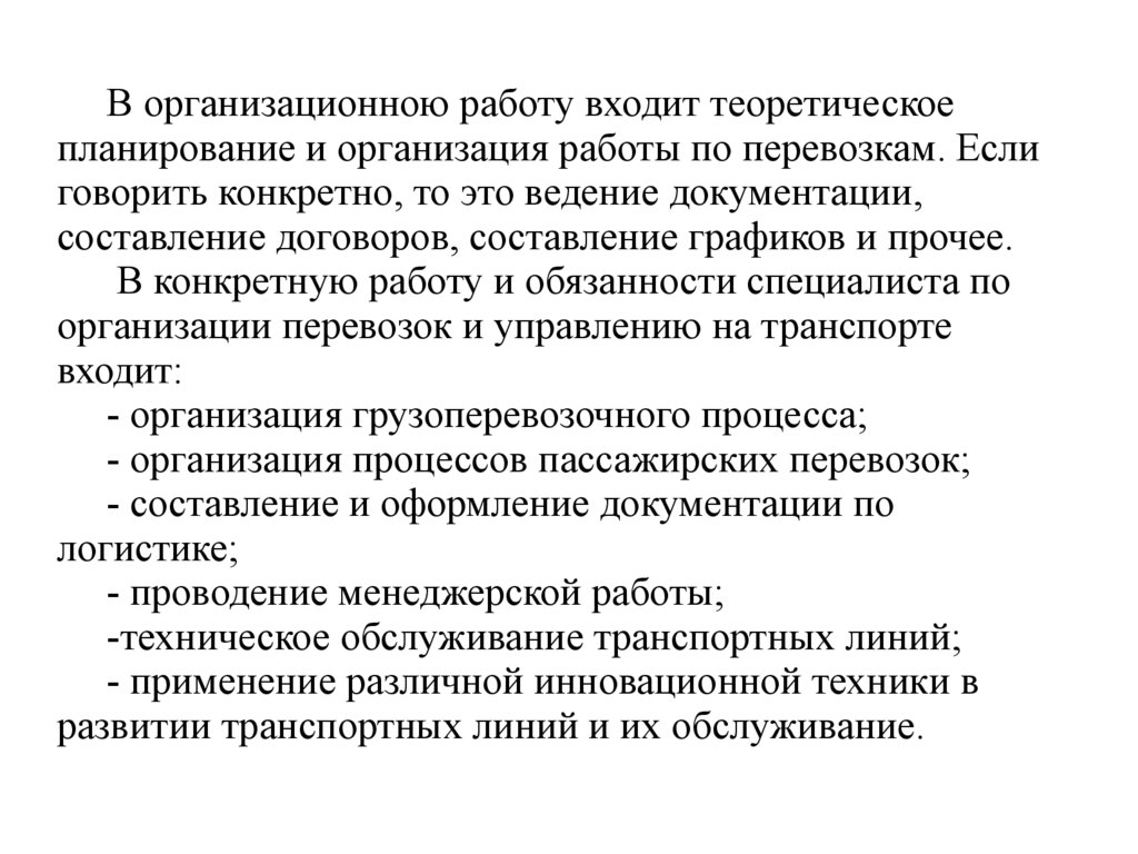 В организационною работу входит теоретическоепланирование и организация работы по перевозкам. Если
