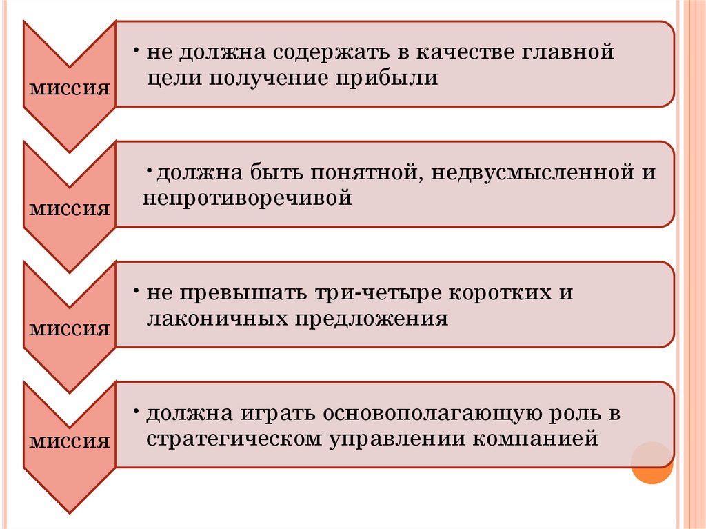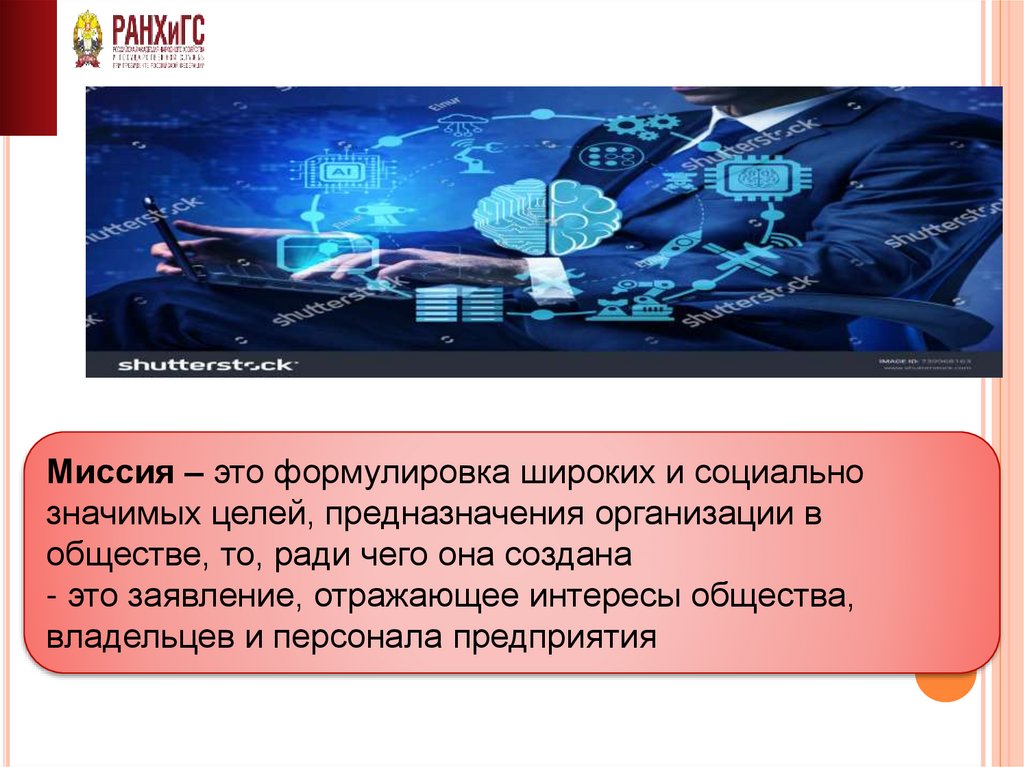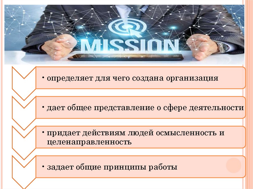 Миссия – это формулировка широких и социальнозначимых целей, предназначения организации в