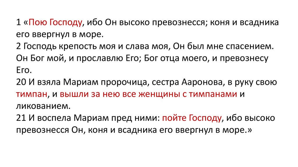 1 «Пою Господу, ибо Он высоко превознесся; коня и всадникаего ввергнул в море.