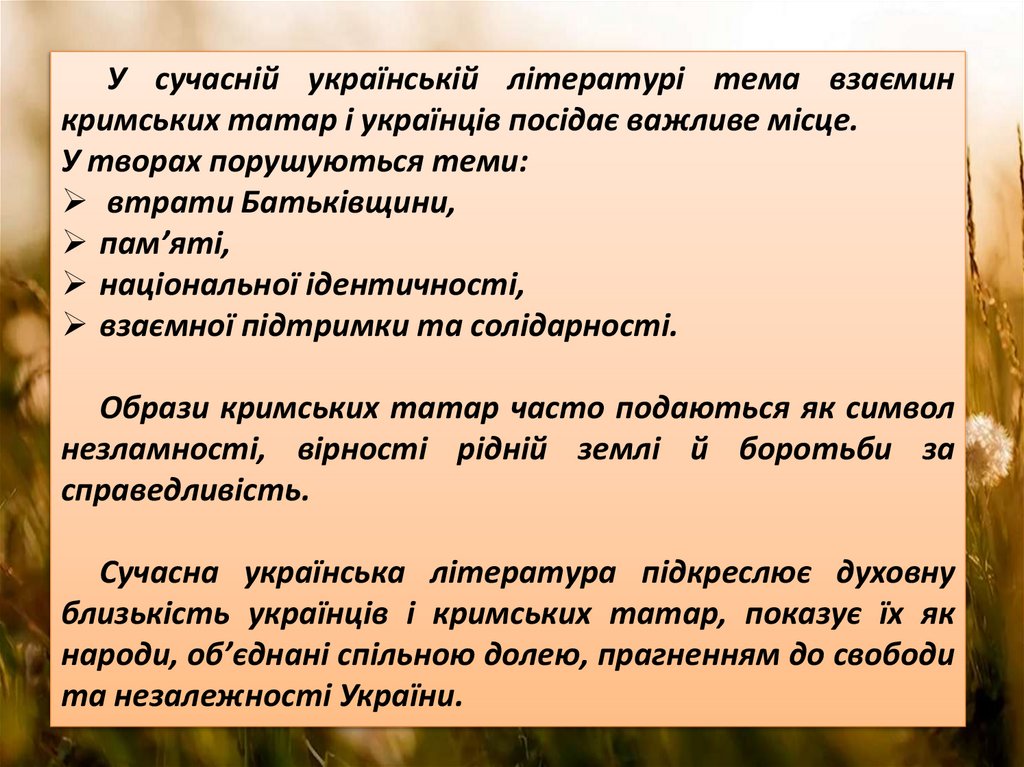 У сучасній українській літературі тема взаєминкримських татар і українців посідає важливе місце.
