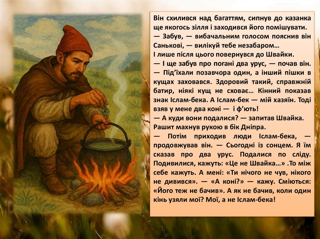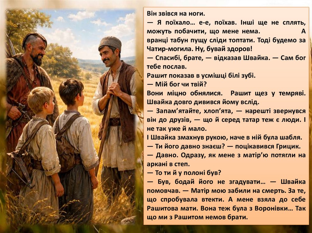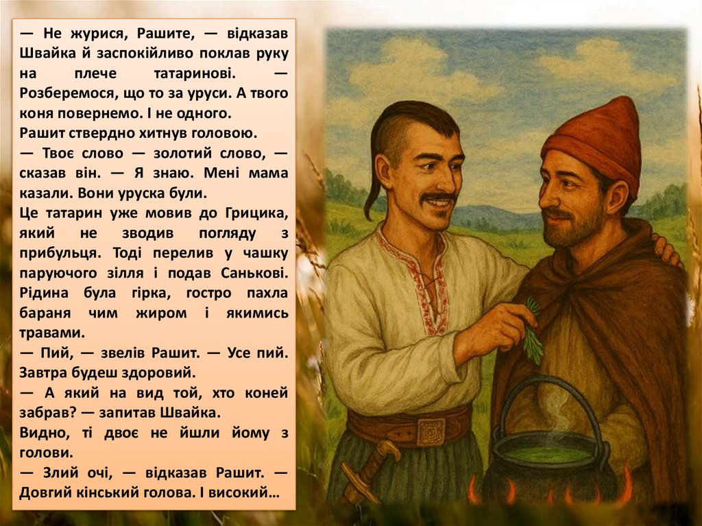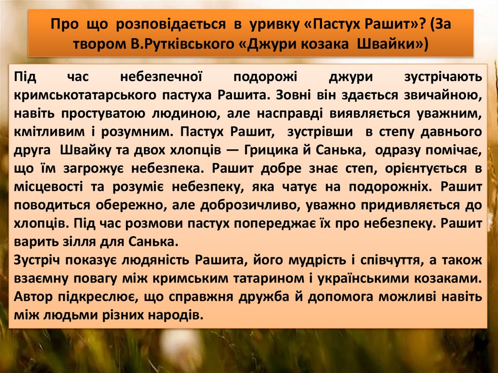 Про що розповідається в уривку «Пастух Рашит»? (Затвором В.Рутківського «Джури козака Швайки»)
