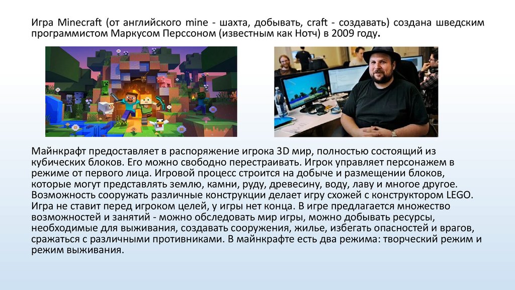 Игра Minecraft (от английского mine - шахта, добывать, craft - создавать) создана шведскимпрограммистом Маркусом Перссоном (известным как Нотч) в 2009 году.