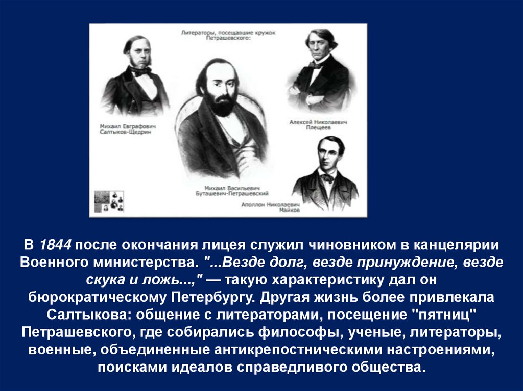В 1844 после окончания лицея служил чиновником в канцелярииВоенного министерства. "...Везде долг, везде принуждение, везде