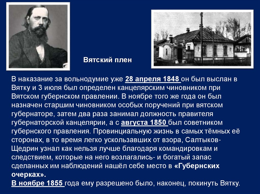 Писатель был выслан в Вятку за "...вредный образ мыслей и