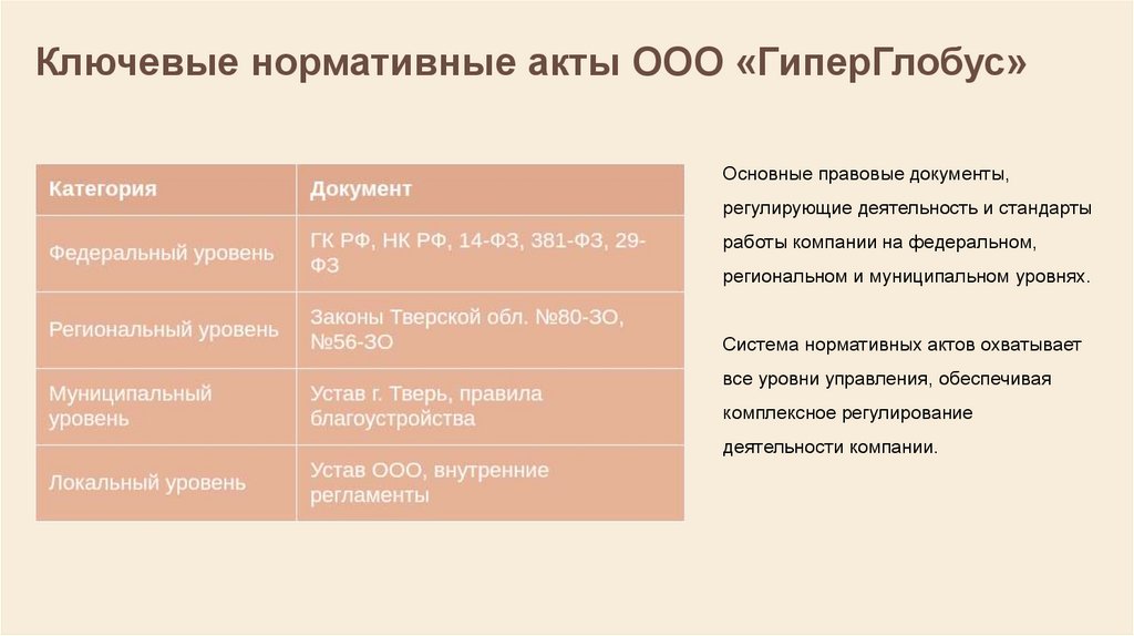 Ключевые нормативные акты ООО «ГиперГлобус»Основные правовые документы,