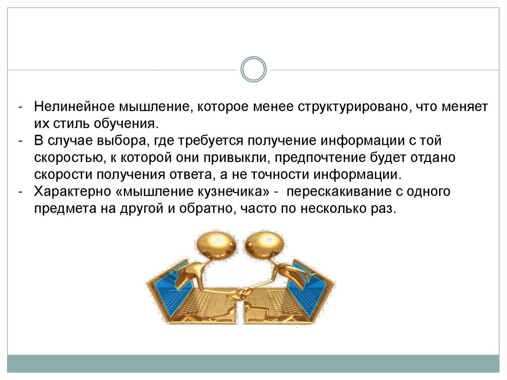 - Нелинейное мышление, которое менее структурировано, что меняетих стиль обучения.