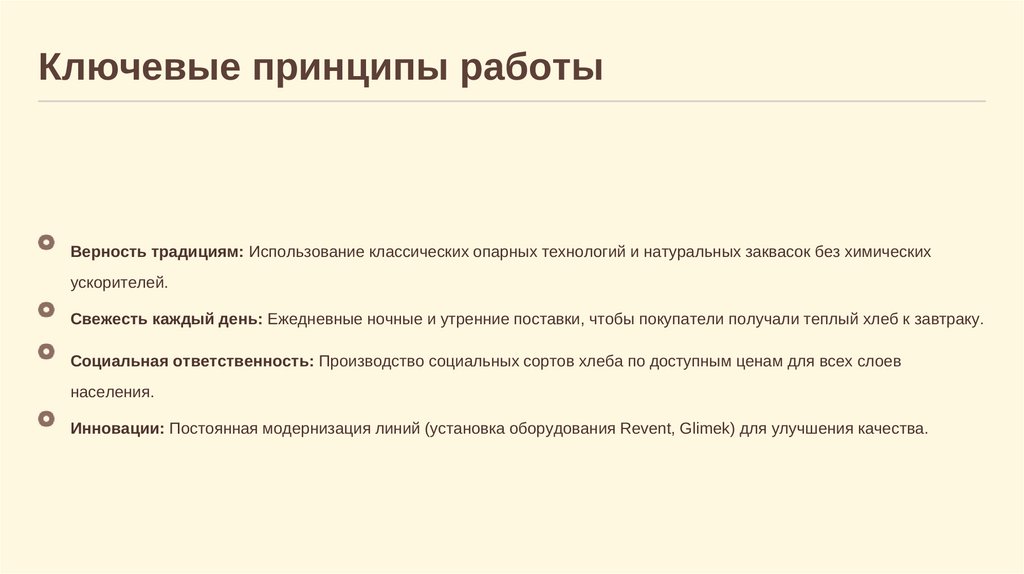 Ключевые принципы работыВерность традициям: Использование классических опарных технологий и натуральных заквасок без химических