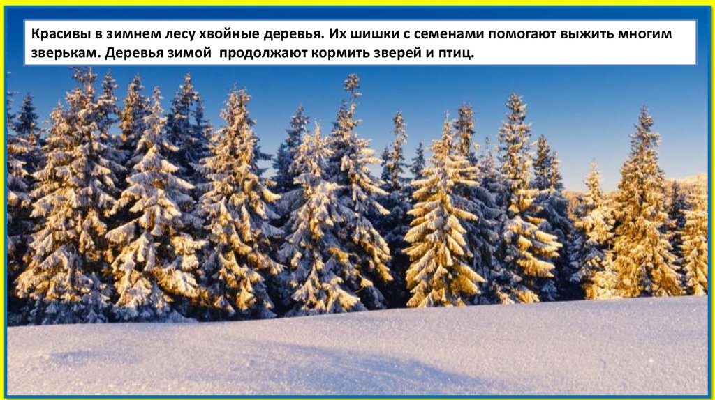 Красивы в зимнем лесу хвойные деревья. Их шишки с семенами помогают выжить многимзверькам. Деревья зимой продолжают кормить зверей и птиц.