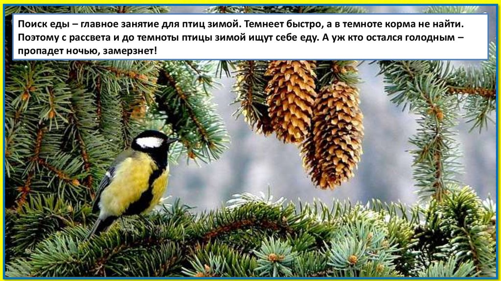 Поиск еды – главное занятие для птиц зимой. Темнеет быстро, а в темноте корма не найти.Поэтому с рассвета и до темноты птицы зимой ищут себе еду. А уж кто остался голодным –