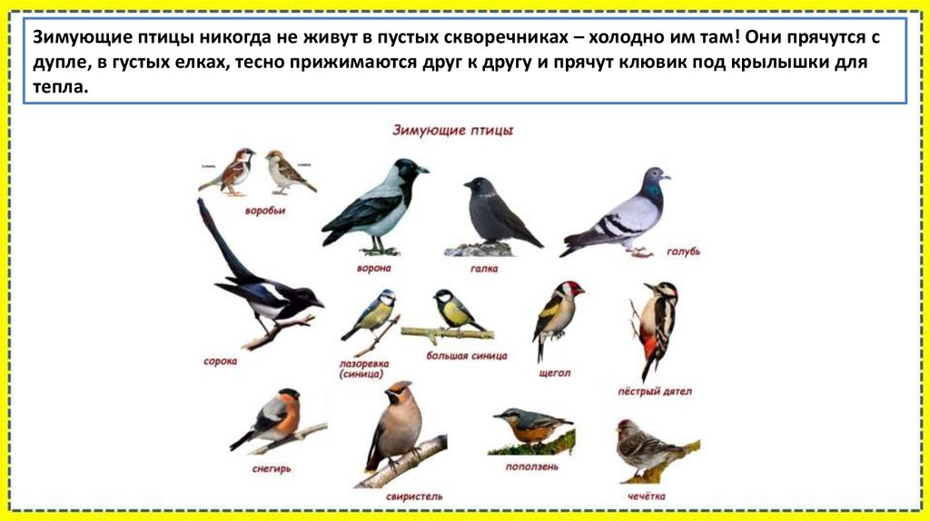 Зимующие птицы никогда не живут в пустых скворечниках – холодно им там! Они прячутся сдупле, в густых елках, тесно прижимаются друг к другу и прячут клювик под крылышки для