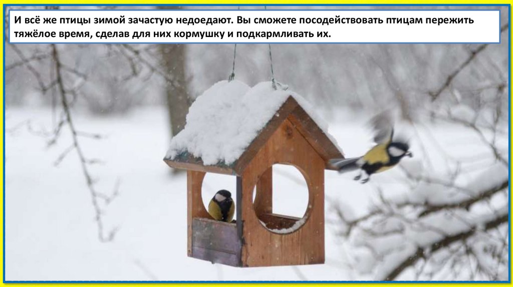 И всё же птицы зимой зачастую недоедают. Вы сможете посодействовать птицам пережитьтяжёлое время, сделав для них кормушку и подкармливать их.