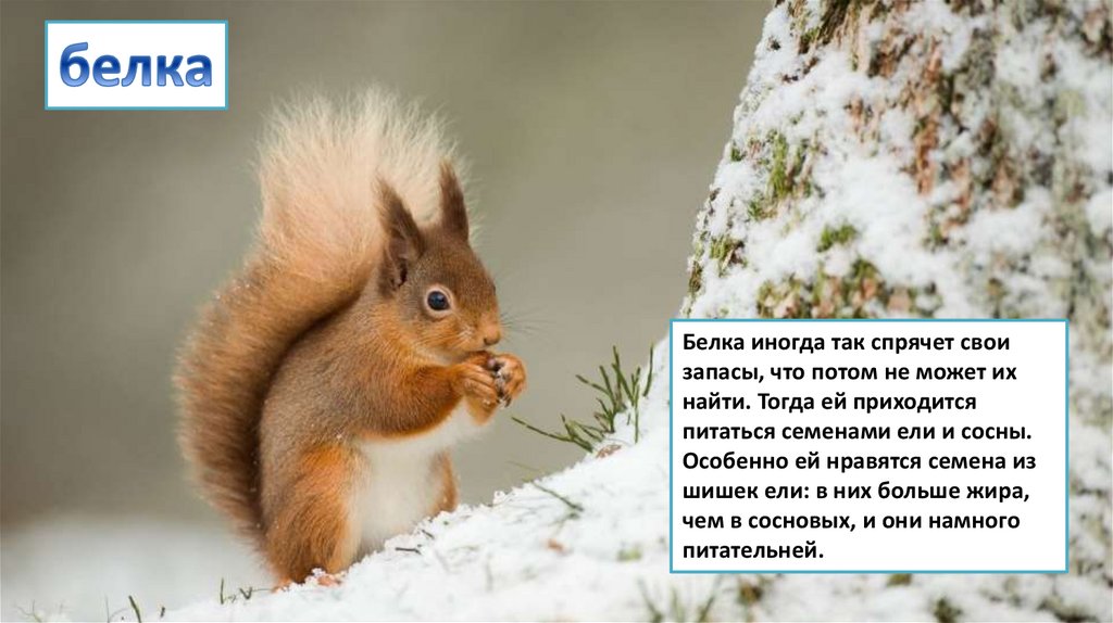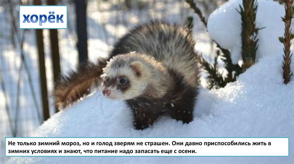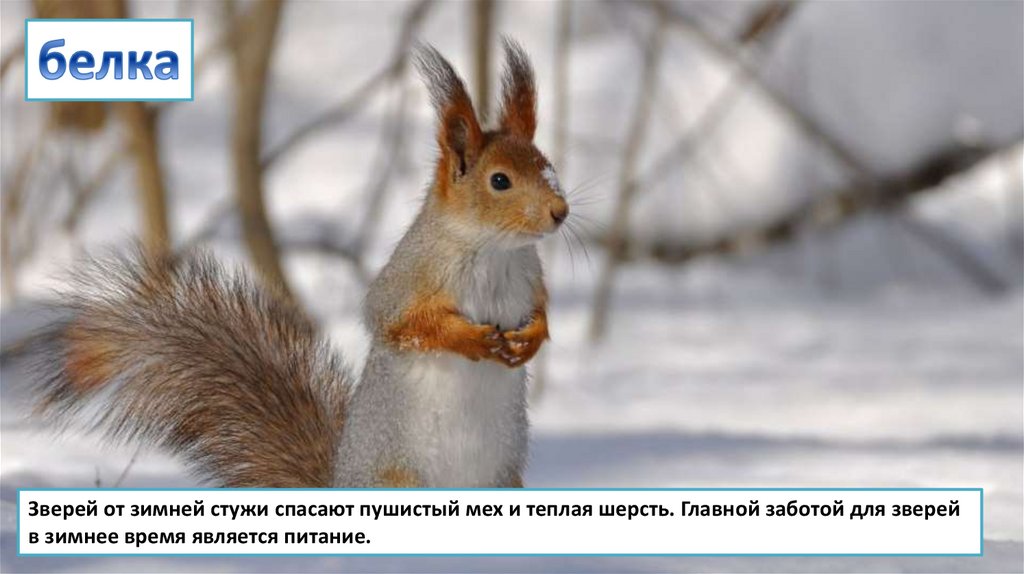 Зверей от зимней стужи спасают пушистый мех и теплая шерсть. Главной заботой для зверейв зимнее время является питание.